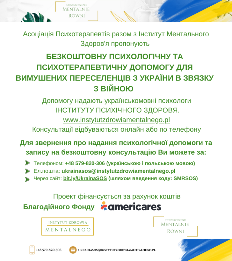 DARMOWE TELEFONICZNE KONSULTACJE PSYCHOLOGICZNE DLA UCHODŹCÓW Z UKRAINY, PROWADZONE W JĘZYKU UKRAIŃSKIM. 1) +48 579-820-306 2) UKRAINASOS@INSTYTUTZDROWIAMENTALNEGO.PL 3) PORTAL: BIT.LY/UKRAINASOS (PODCZAS REZERWACJI WIZYTY NALEŻY WPISAĆ KOD: SMRSOS)